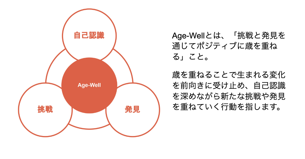 *挑戦と発見を通じてポジティブに歳を重ねることを「Age-Well」と掲げ、伴走する人材を「Age-Well Designer」と定義しています。
