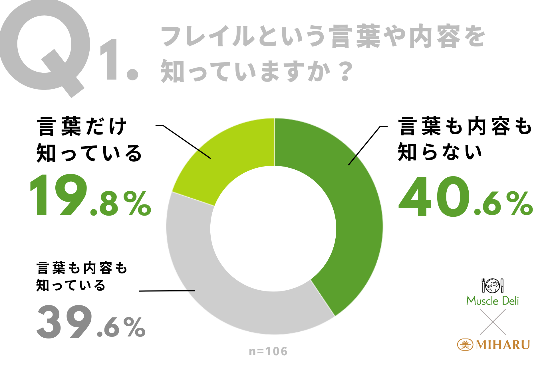 Q1.「フレイルという言葉や内容を知っていますか?」という問いに対し、「言葉も内容も知らない」と答えた人が40.6%で最も多く、次いで「言葉も内容も知っている」と答えた人は39.6%、「言葉だけ知っている」は19.8%となりました。
