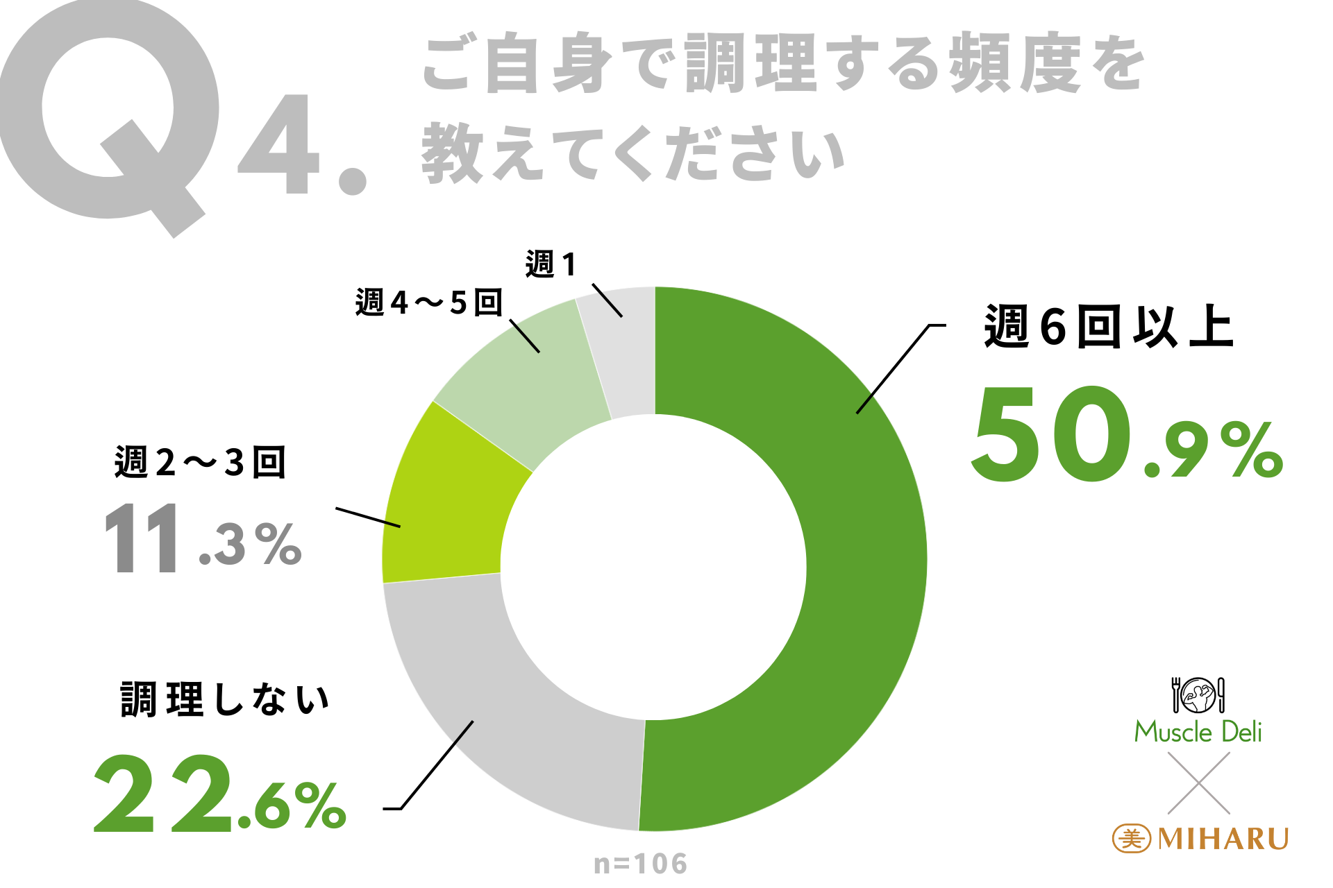 続いて、Q4.「ご自身で調理する頻度を教えてください」という問いに対しては、「週6回以上」が50.9%と最も多くなりました。