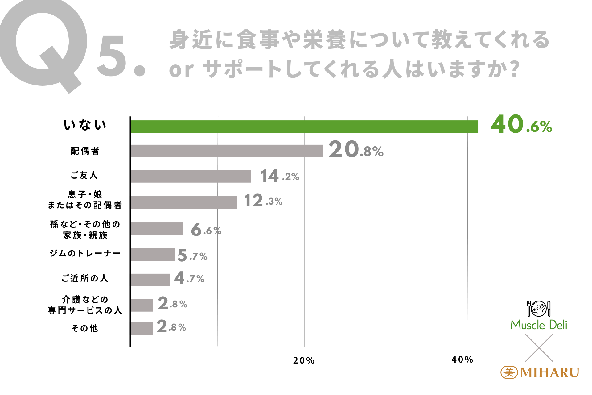Q5.「身近に食事や栄養について教えてくれるorサポートしてくれる人はいらっしゃいますか?」という問いに対して40.6%が「いない」という回答となりました。