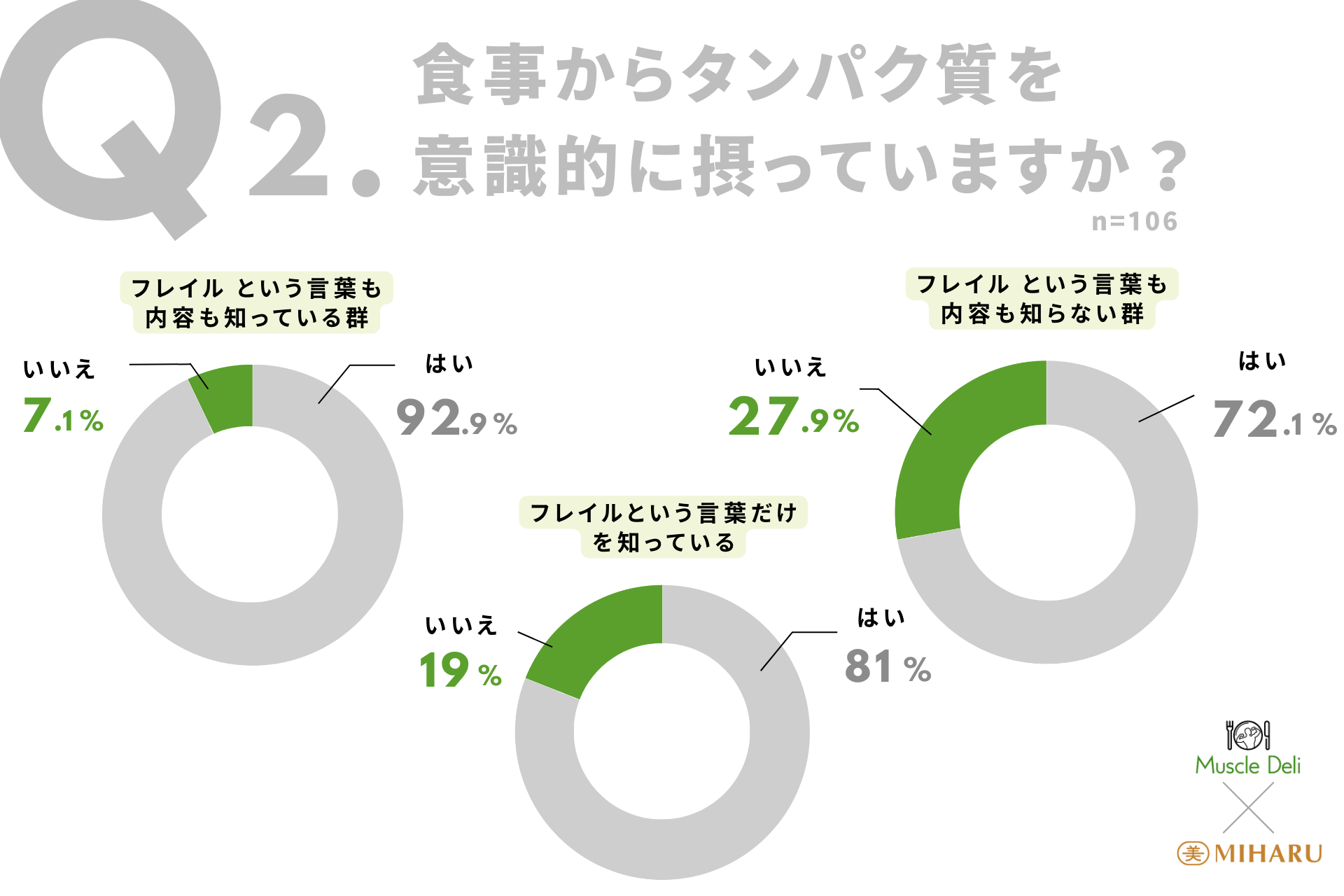 さらに、Q2.「食事からタンパク質を意識的に摂っていますか?」という問いに対しては、「フレイルという言葉も内容も知っている」と回答した92.9%が「はい」と答えた一方で、「フレイルという言葉も内容も知らない」と回答した人は「いいえ」が27.9%と、言葉の意味を正しく理解していない人ほど食事にタンパク質を摂りいれていないことが分かりました。